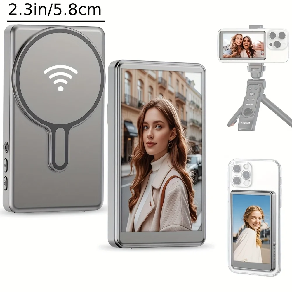 Introducing the Mobile Phone Magnetic Selfie Monitor Screen, an innovative accessory designed to enhance your vlogging and streaming experience on both iPhone and Android devices. This versatile tool allows users to effortlessly capture stunning wide-angle shots by adjusting the position of their phone's rear camera. Whether you're taking fashion photos or documenting your travels, this monitor screen ensures that you can include more content in your frame for a more dynamic visual storytelling experience. The easy-to-grip design makes it user-friendly, enabling you to take beautiful photos with minimal effort.